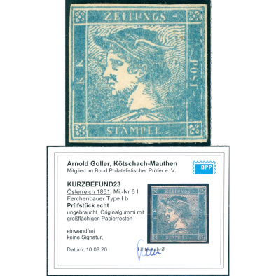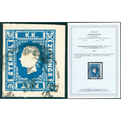 1858 Austria – deep dark blue (tiefdunkelblau) newspaper stamp Ferchenbauer 1100 EUR – Attest Goller