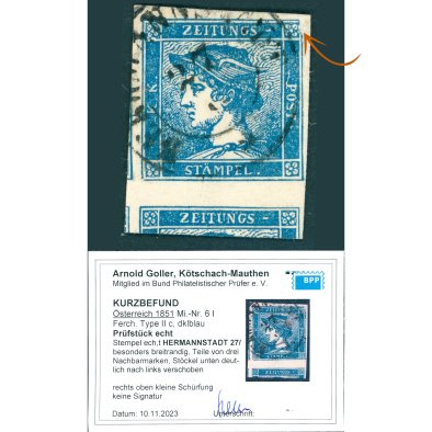 1851 Austria newspaper stamp blue Mercury II.c type dark blue, 4 stamps can be seen when cut wide – small plate error – HERRMANNSTADT postmark – Attest Goller