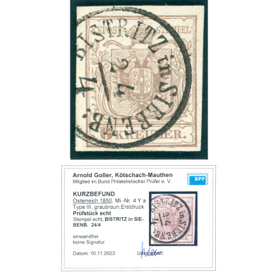 1850 Austria 6kr MP type III., greyish brown, first printing – BISTRITZ in SIEBENB: postmark – Ferchenbauer 55 EUR – Attest Goller
