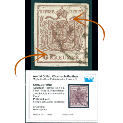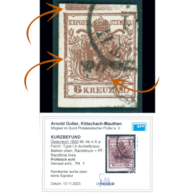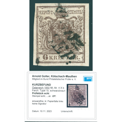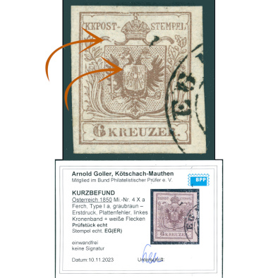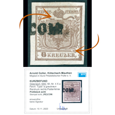 1850 Austria 6kr HP Type I greyish-brown, marginal printing, plate error – Attest Goller
