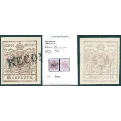 1850 Austria 6kr HP Ia type greyish-brown, machine colour offset – RECOM postmark Mueller 72p – Ferchenbauer 60 EUR – Attest Goller