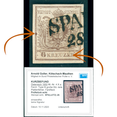 1850 Austria 6kr MP III type, plate error Ferchenbauer 117 / +40 EUR + larger colour spot 125 EUR – Attest Goller