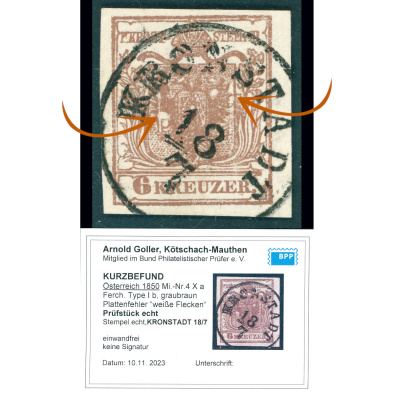 1850 Austria 6kr HP Ib type, watermarked stamps with plate defect – KRONSTADT postmark – Ferchenbauer 74,75 / ~100 EUR – Attest Goller