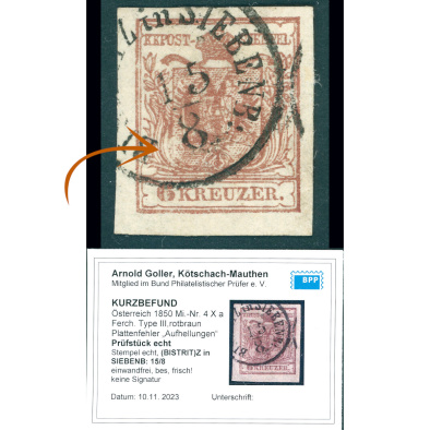 1850 Austria 6kr HP Type III reddish brown, light blur plate error – BISTRITZ in SIEBENB: stamped – Attest Goller