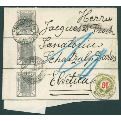• 1907 Romania – triple-used wrapper sent to Switzerland with 10c postage due