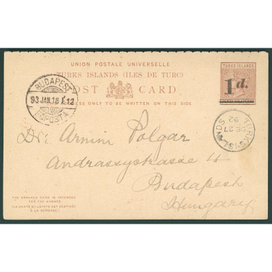 1891 Turks Islands overprinted postal stationery sent to Hungary – rare destination