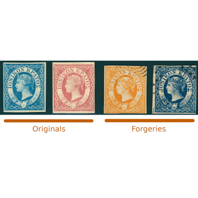 1859 Ionian Islands two original mint * stamps and two forgeries