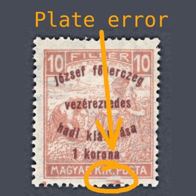 • 1917 Hungary – Margaret Island / Military Exhibition of Joseph Archduke, mint hinged *, significant printing error on the bottom of the base stamp