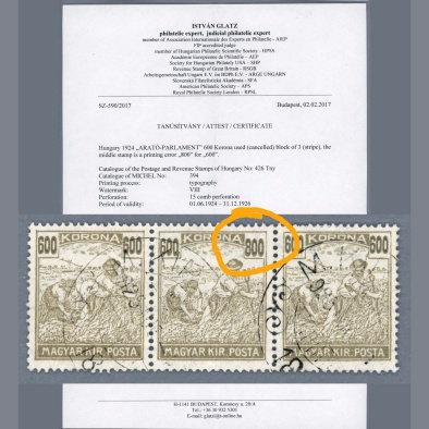 • 1924 Hungary – Reaper 600 / 800 korona misprint, in used triple stripe – very rare seen in used context | Attest: Glatz | Phu: 426Tny / 375 EUR