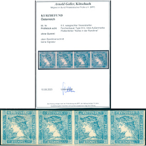 • 1851 Ausztria kék merkúr használatlan négyescsík “Kerbe in der Randlinie” lemezhibával – Attest Goller