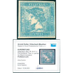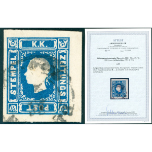 • 1851 Ausztria kék merkúr használatlan enyvezés nélkül Ib tipus “geripptes” papírral Fercbenbauer 135 EUR