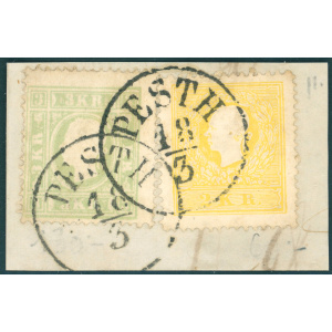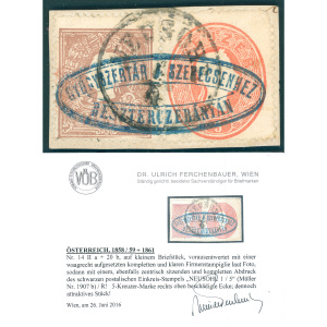 • 1858 2 kr + 3 kr dekoratív kivágáson PESTH bélyegzéssel Ferchenbauer 425 EUR