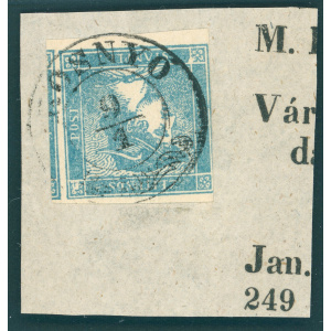 1851 Ausztria kék merkúr világoskék Ib tipus címszallag darabon ROSNYÓ bélyegzéssel – Ferchenbauer 250 EUR