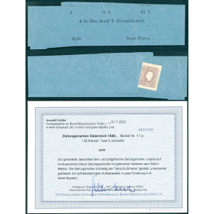 1858 Ausztria – sötétlila (dunkelila) hírlapbélyeg címszallagon – Aradszentmárton – Ferchenbauer 1.100 EUR – Attest Goller