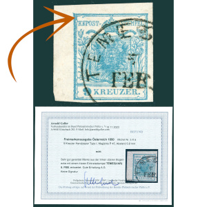 1850 Ausztria 9kr I. tipus – Magistris P45 – Abstand 0,8mm + Rand + Plattenfehler + TEMESVÁR bélyegzés – Ferchenbauer 180 EUR – Attest Goller