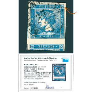 1858 Ausztria mélysötétkék (tiefdunkelblau) újságbélyeg Ferchenbauer 1100 EUR – Attest Goller