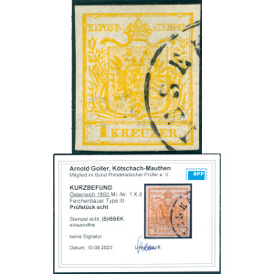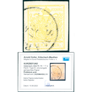 1850 Ausztria 1kr III. tipus citromsárga – KÉSMARK bélyegzéssel – Attest Goller – Ferchenbauer 140 EUR
