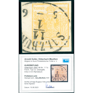 1850 Ausztria 1kr Ib tipus – ocker sárga, 5mm ívszéllel SALZBURG bélyegzéssel – Ferchenbauer 175 EUR the rand is + 315 EUR