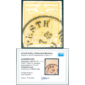 1850 Ausztria 1kr type Ib aranysárga + 0,12mm kartonpapíron PESTH bélyegzéssel – Ferchenbauer 330 EUR