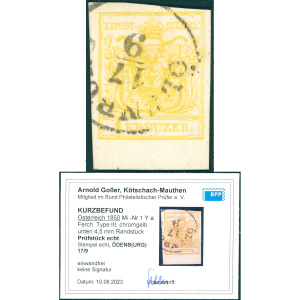 1850 Ausztria 1kr type III krómsárga alul 4,5mm ívszéllel ÖDENBURG bélyegzéssel – Ferchenbauer ~200 EUR