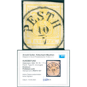 • 1850 Ausztria 1kr type III krómsárga PESTH bélyegzéssel – Ferchenbauer 135 EUR