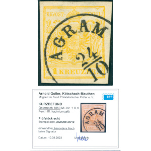 • 1850 Ausztria 1kr type III, kadmium sárga AGRAM bélyegzéssel – Ferchenbauer EUR