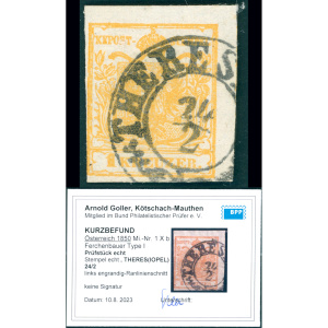 • 1850 Ausztria 1kr type I, THERESIOPL bélyegzéssel – Gudlin 350p – Mueller 10*3p – Ferchenbauer 200 EUR
