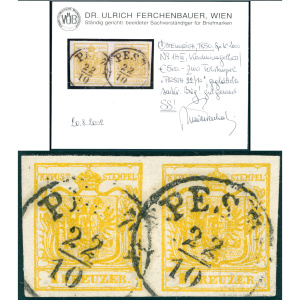 • 1850 Austria 1kr pár kadmiumsárga kézi papír III. tipus PESTH bélyegzéssel – Attest Fercbenhauer – Ferbenhauer 500 EUR