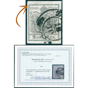 1850 Ausztria 2kr kézipapír I.a tipus szürke – lemezhiba a bal felső saroknál – Ferchenbauer 570 EUR – Attest Goller