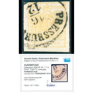 • 1850 Ausztria 1kr MP Ib tipus okkersárga – PRESSBURG bélyegzés – Ferchenbauer 175 EUR – Attest Goller