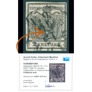 • 1850 Ausztria 2kr HP I.a tipus, fekete, lemezhiba – Attest Goller