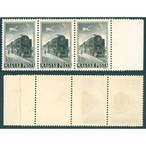 • 1950 Repülő V. 3Ft postatiszta ** ívszéli hármascsík ragasztott papíron PHu 150.000+ Ft