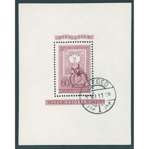 • 1951. 80 ÉVES A MAGYAR BÉLYEG pecsételt lila blokk PHu 450.000 ft