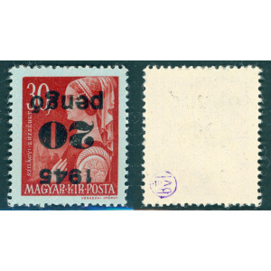 • 1945 . Kisegítő bélyeg 20P / 30f postatiszta ** fordított felülnyomattal BÉVI vizsgálójellel Mi. 816. PHu 858. / 25. 000 Ft
