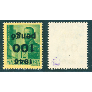 • 1945 . Kisegítő bélyeg 100P / 12f postatiszta ** fordított felülnyomattal BÉVI vizsgálójellel Mi. 819. PHu 861. / 30. 000 Ft