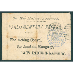 1889 Ausztrália – Victoria állam – parlamenti iratok az osztrák-magyar konzul számára – kék “The treasurer / frank stamp”-al bérmentve