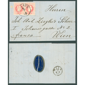 • 1869 konzulátusi posta Romániában – céges (Herdan & Schönfeld) boríték 10 sld bélyeggel BUCAREST feladással, Ausztriába küldve