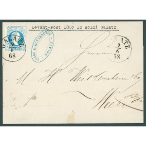 • 1867 május (!) konzulátusi posta Romániában – rendívül ritka fekete JBRAILA bélyegzéssel Ausztriába küldve