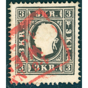 • 1858 Ausztria fekete 3kr II. tipus piros bélyegzéssel Ferchenbauer 380 EUR