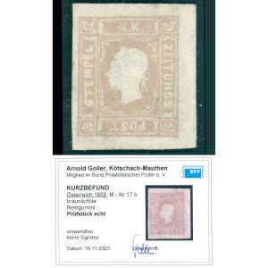 1858 Ausztria hírlapbélyeg barnáslila használatlan * – Ferchenbauer 1.300 EUR – Attest Goller