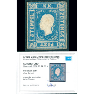 1858 Ausztria hírlapbélyeg kék használatlan (*) – Ferchenbauer 150 EUR – Attest Goller