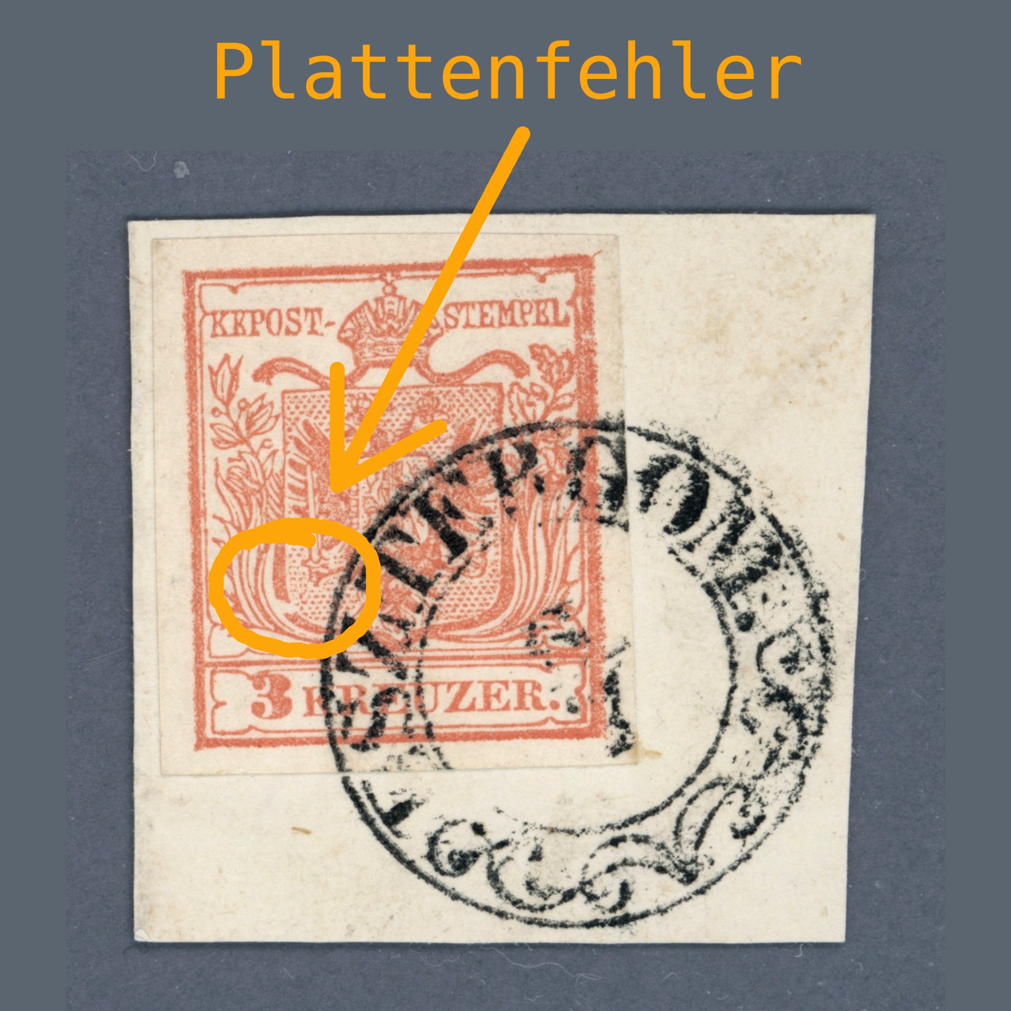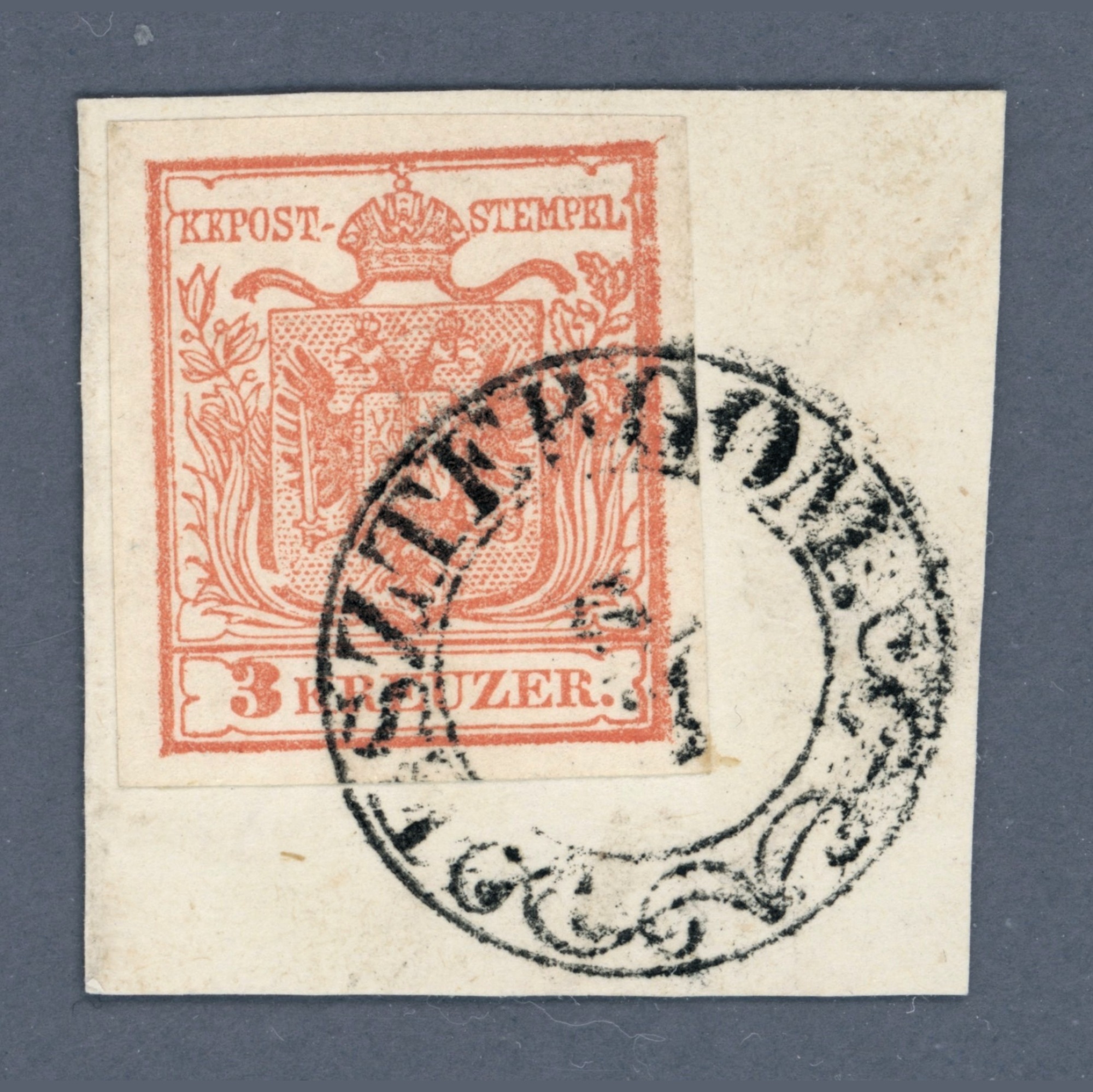 1850 Ausztria – 3 kr I. típus lemezhibával kivágáson szép ESZTERGOM bélyegzéssel | Gudlin 300 pont | Müller: 15*3 pont