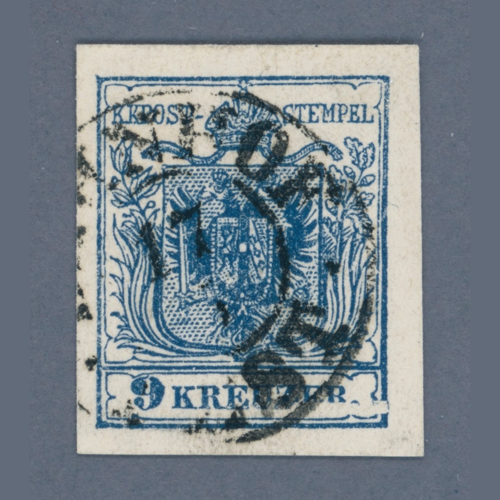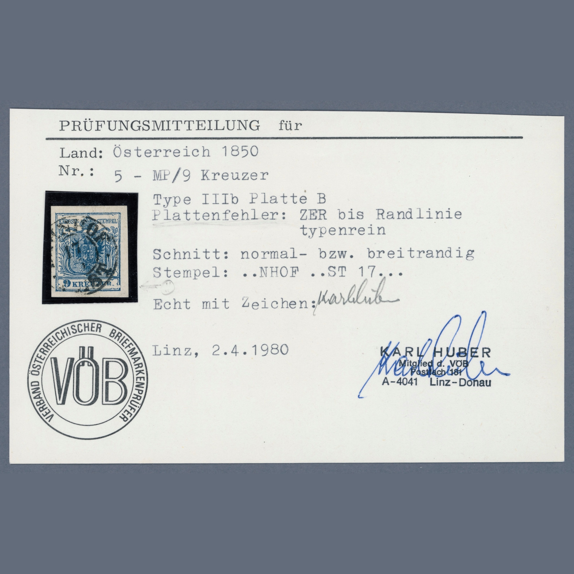 1850 Ausztria – 9 kr IIIb típus – BAHNHOF / PESTH bélyegzéssel – attest: Hüber | Ferchenbauer: 214. lemezhiba / 80 EUR