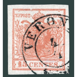 1850 Ausztria Lombard-Velence – 15 centimes bélyeg, I. típus “geripptes” papíron VERONA bélyegzéssel, apró lemezhiba | Ferchenbauer: 180 EUR