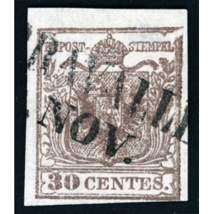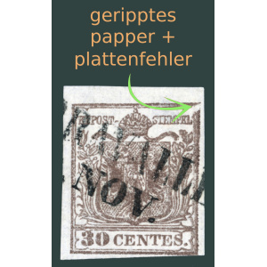 1850 Ausztria Lombard-Velence – 30c I. típus “geripptes” papír – lehelletnyi elvékonyodás + látványos lemezhibával | Ferchenbauer: 85++ EUR