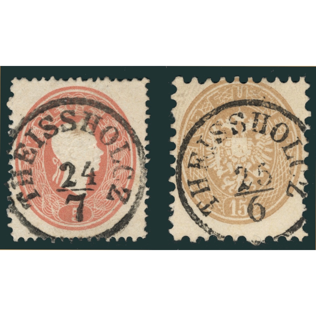 1861 / 1864 Ausztria – két szép THEISSHOLCZ (Tiszolc) lebélyegzés – Gudlin 2 * 250 pont | Müller 2 * 30 pont