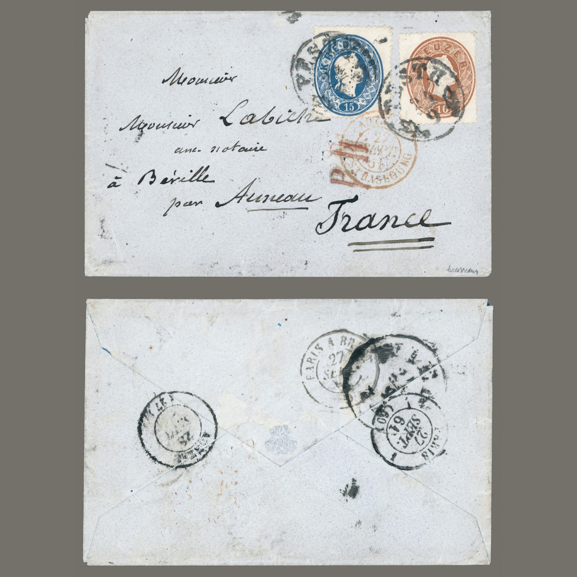 1861 Austria – Magyarország – kis méretű boríték Pestről Franciaországba küldve – dekoratív darab