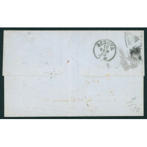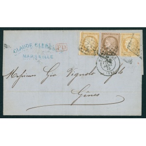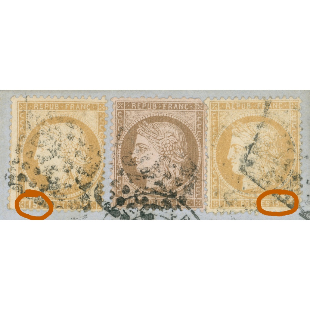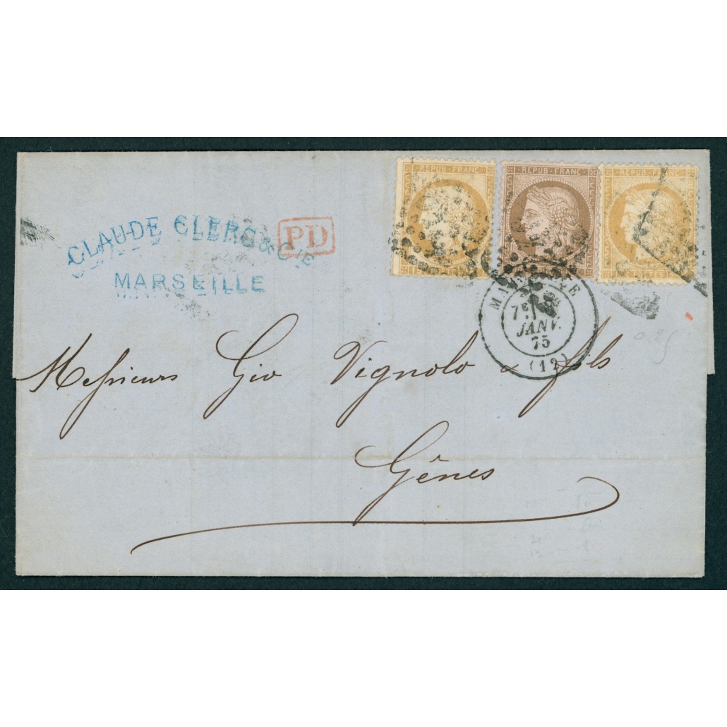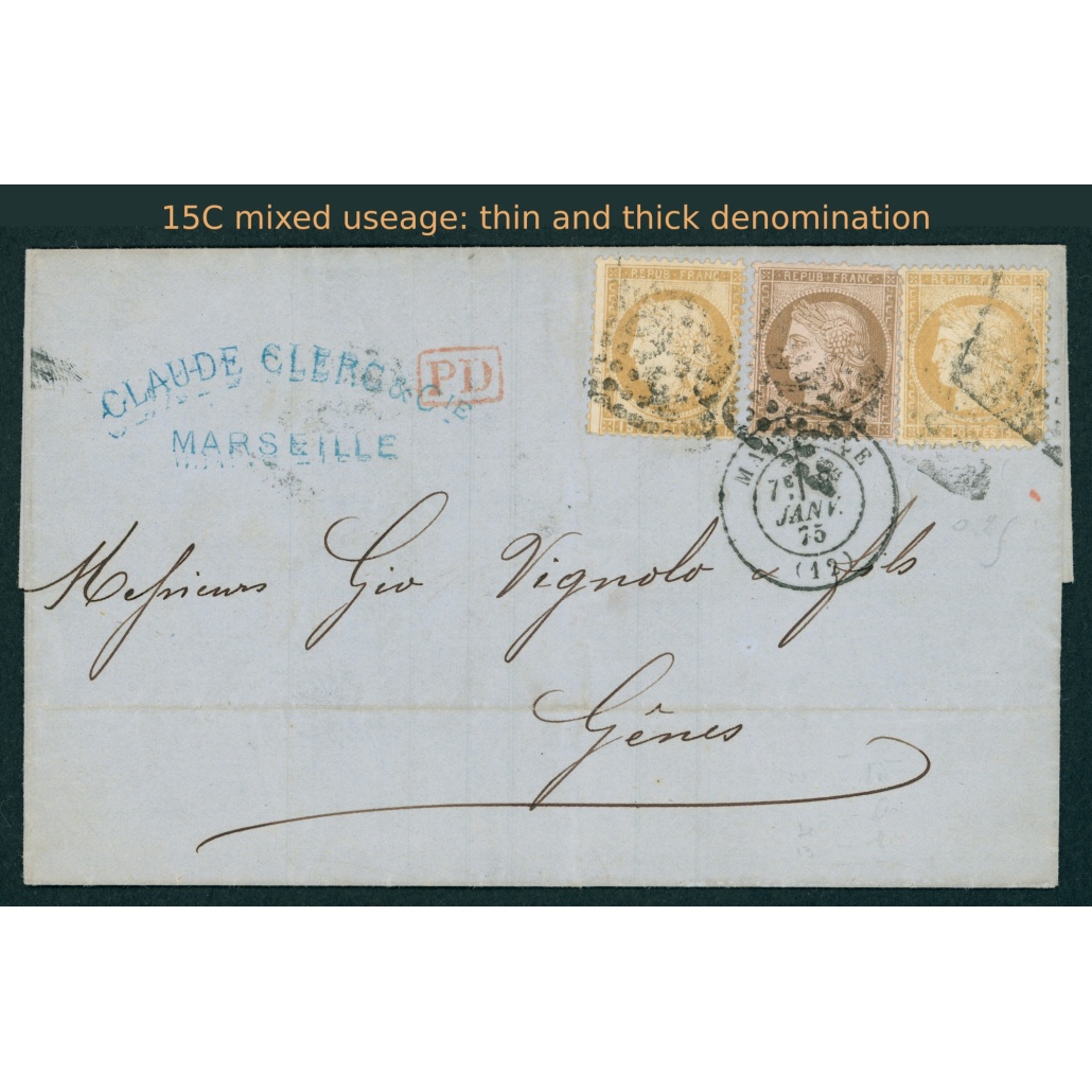 1875 Franciaország – Genfbe küldött levélen vegyes bérmentesítés / eltérő kiadású 15c Ceres bélyegek: nagy és kis számjegyek