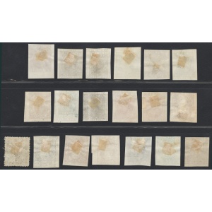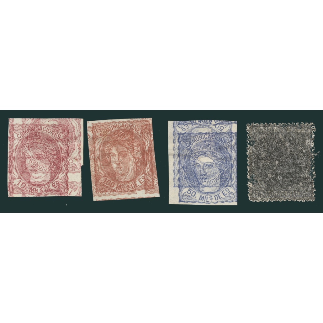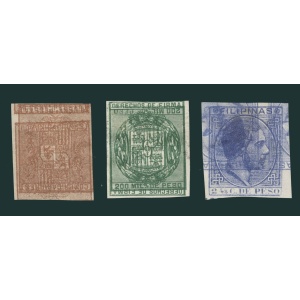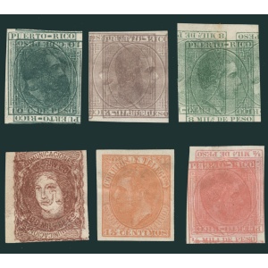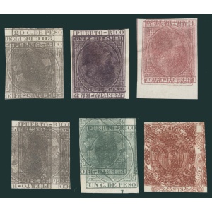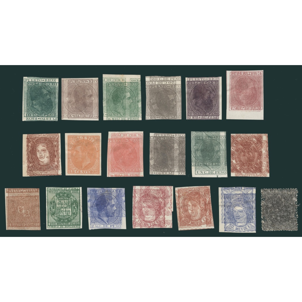 1880 Spanyolország, Fülöp-szigetek, Puerto Rico – 19 db-os tévnyomat gyűjtemény, benne: fordított nyomatok, kettősnyomatok