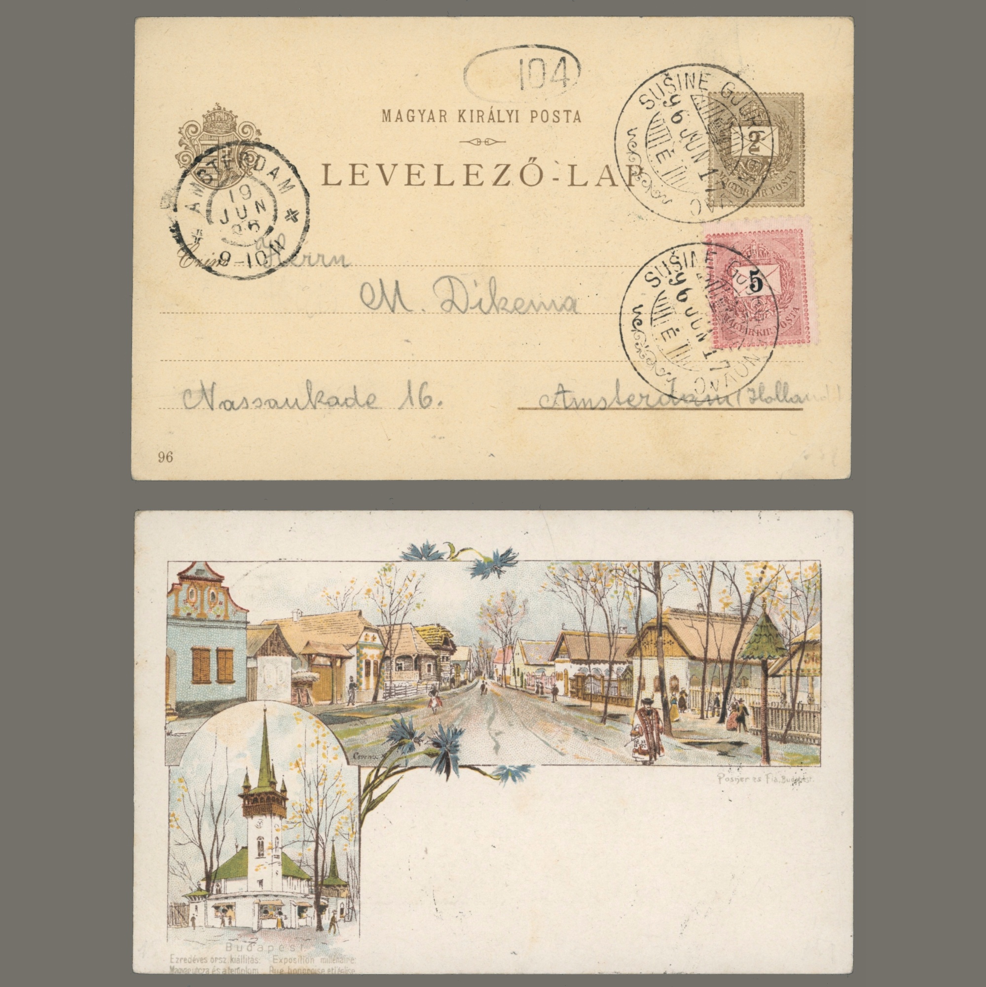 1896 Magyarország – Milleniumi 2 krajcáros díjjegyes levelezőlap Hollandiába küldve 5 kr kiegészítéssel, ritka SUSINE GJURGENHOVAC bélyegzéssel, 2 kr túlbérmentesítéssel – dekoratív darab